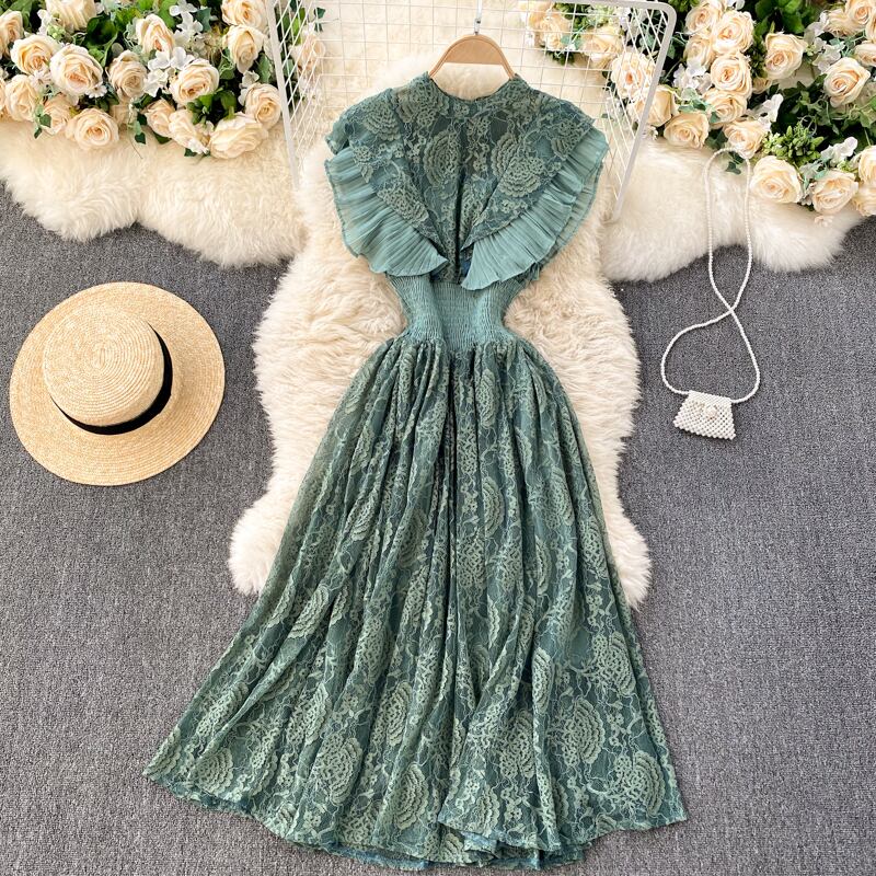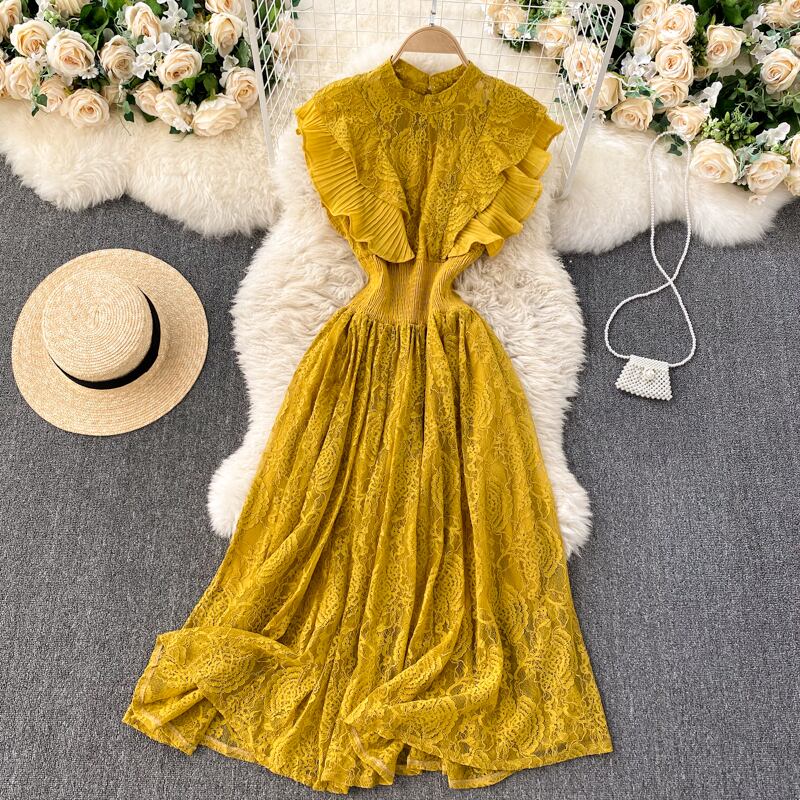 ドレス レディース ワンピース 結婚式 披露宴 発表会 レース フリル シースルー 袖あり ハイウエスト ハイネック 異素材 切り替え 上品 大人 ybh0057