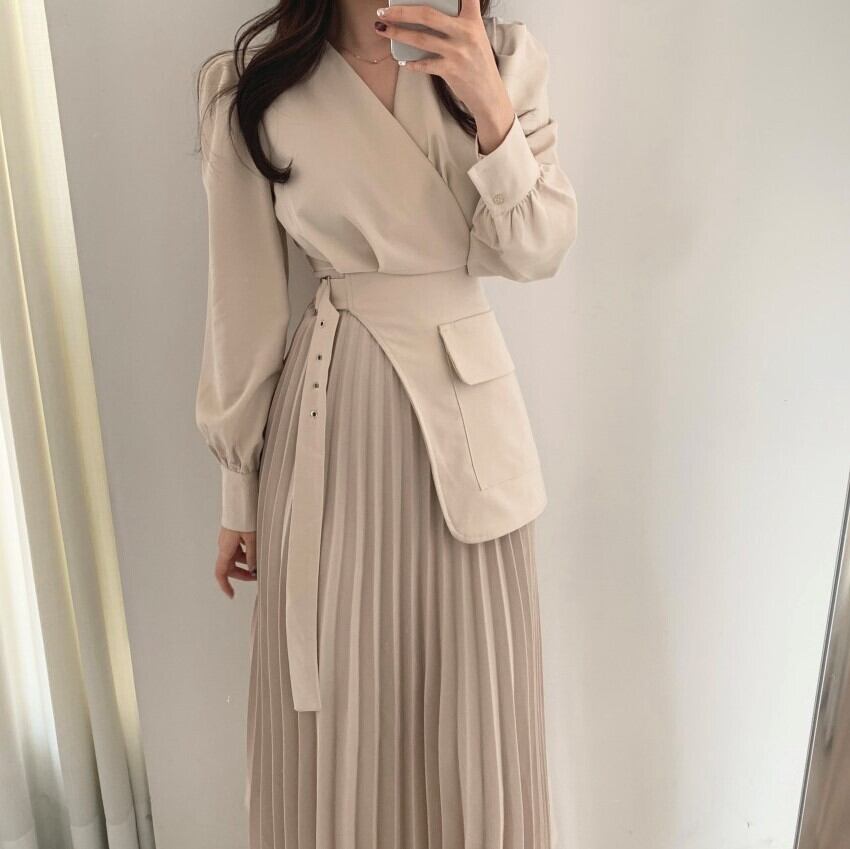 ワンピース レディース 長袖 プリーツ ドッキングワンピース Vネック オフィス パフスリーブ ジャケット 上品 ウエストマーク ybh0395