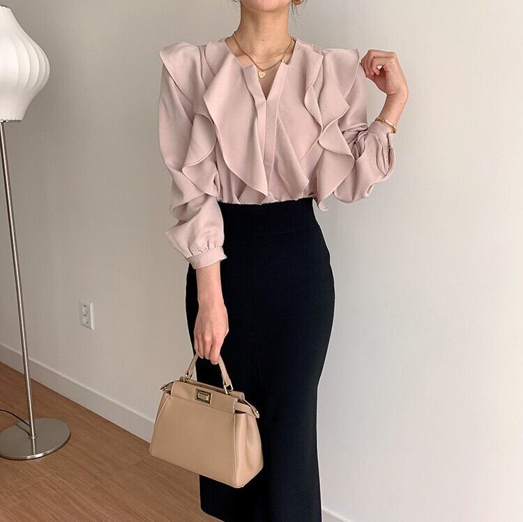 ブラウス レディース トップス 長袖 Vネック フリル 上品 オフィス 大人 ボリュームスリーブ 袖コンシャス ybh0400