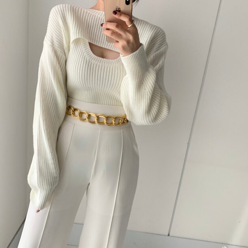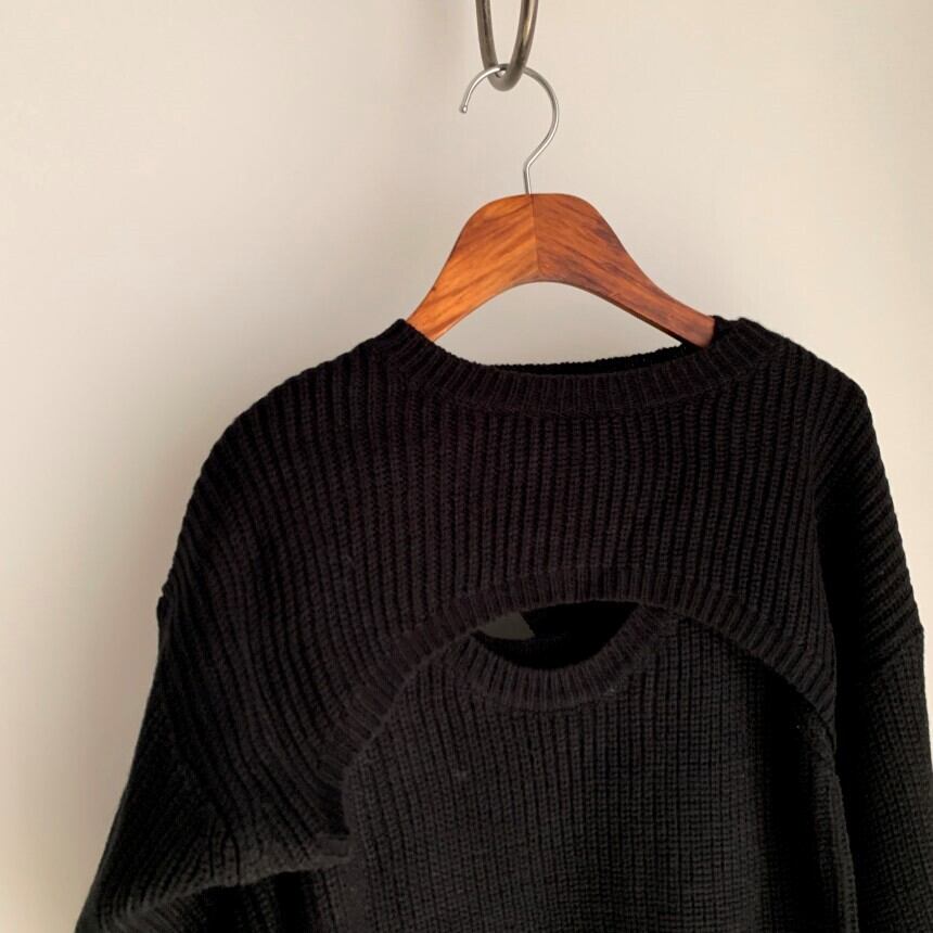 ニット レディース セーター 長袖 トップス セクシー ドロップショルダー リブ 肌見せ 黒 白 大人 ボリュームスリーブ インナー ybh0402