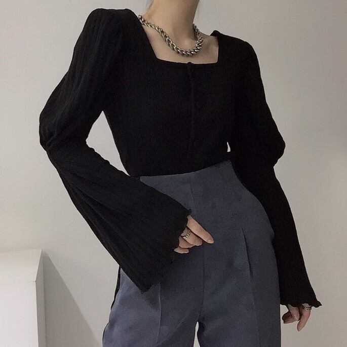 トップス カットソー ニット スクエアネック 袖コンシャス トランペットスリーブ 長袖 パフスリーブ セクシー 大人 カジュアル ybh0403