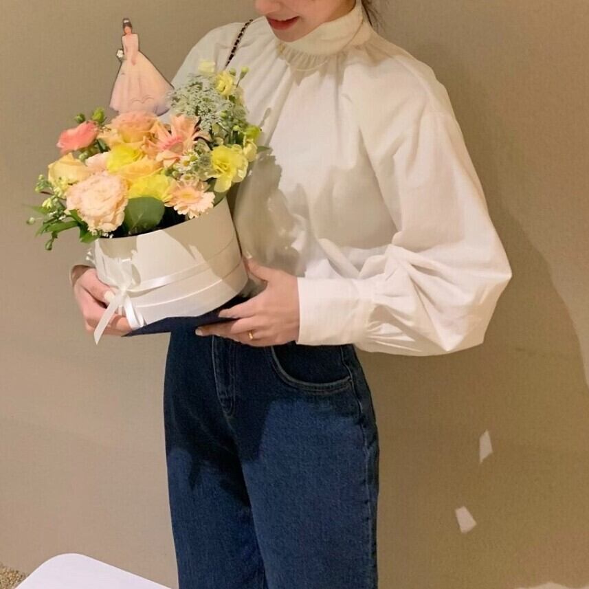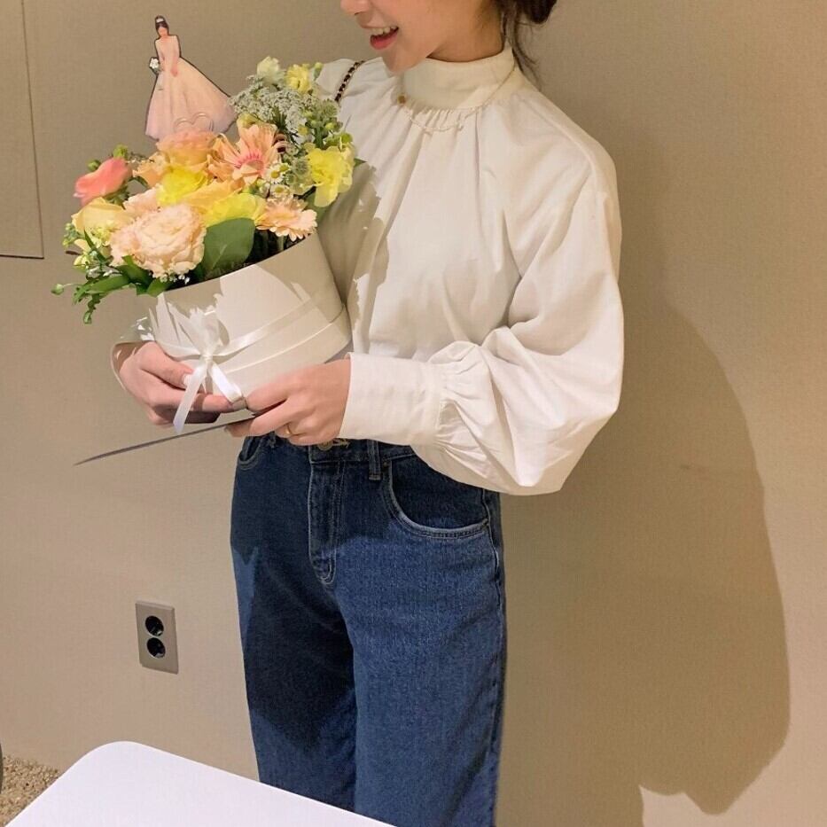 ブラウス ハイネック 英国風 フレンチガーリー 長袖 ボリュームスリーブ 無地 上品 シンプル レディース シャツ トップス スタンドカラー ybh0416