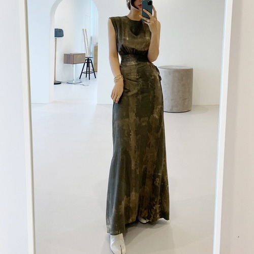 ワンピース ドレス ロング レディース 肌見せ 総柄 ノースリーブ ラウンドネック ハイウエスト 大人 上品 クール ybh0425