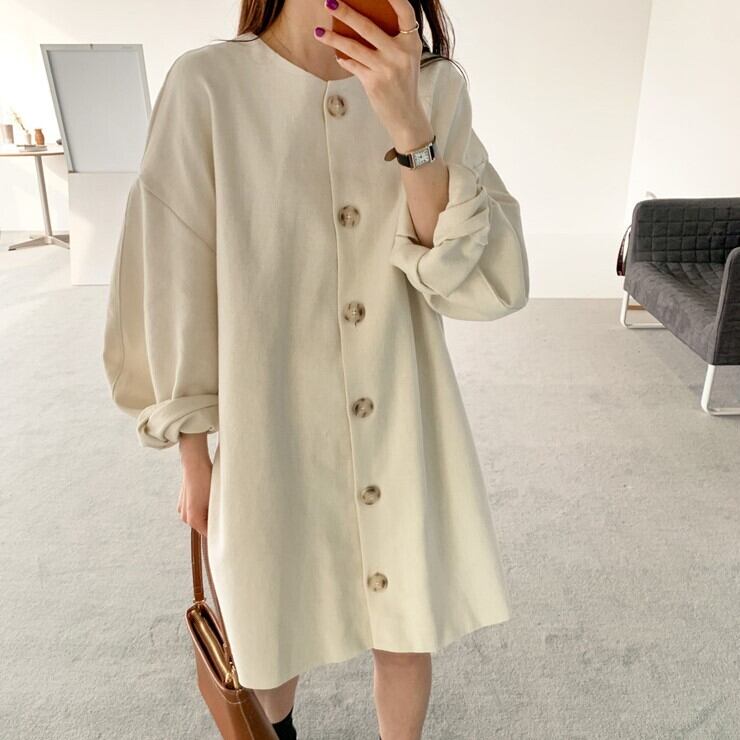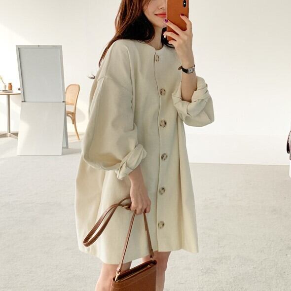 ワンピース レディース ひざ丈 ミニ丈 長袖 ドロップショルダー フロントボタン ラウンドネック シンプル 無地 レディース ybh0435