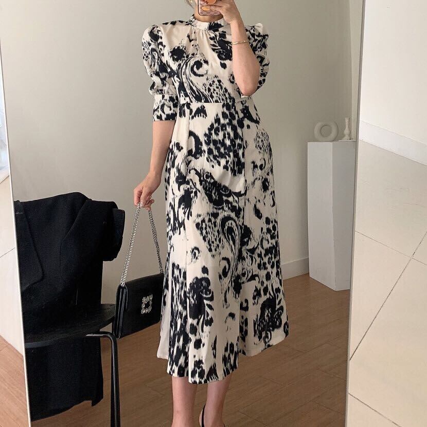 ワンピース レディース 総柄 ロング ハイネック ペイズリー アニマル リボンタイ パワーショルダー 五分袖 お呼ばれ エレガント 大人 ウエストマーク ybh0464