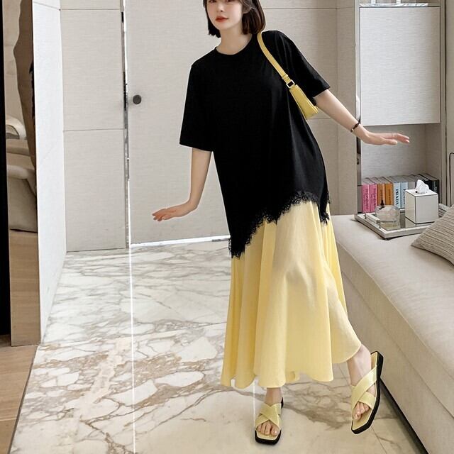 ロングワンピース 半袖 大きいサイズ レディース バイカラー 体型カバー Tシャツ レース 無地 シンプル カジュアル オーバーサイズ 楽ちん リラックス ybh0806
