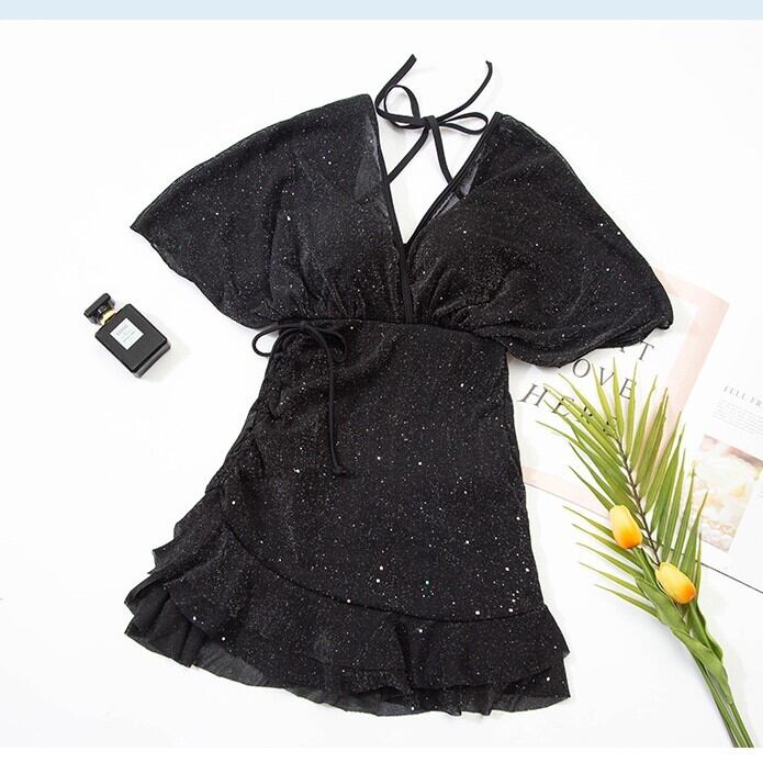 水着 レディース 体型カバー 日焼け対策 スイムウェア Vネック ハイウエスト ワンピース スカート ブラック シンプル 無地 ラメ素材 ybh0866