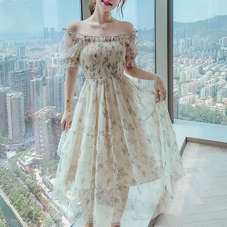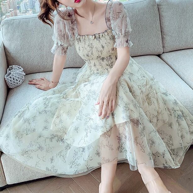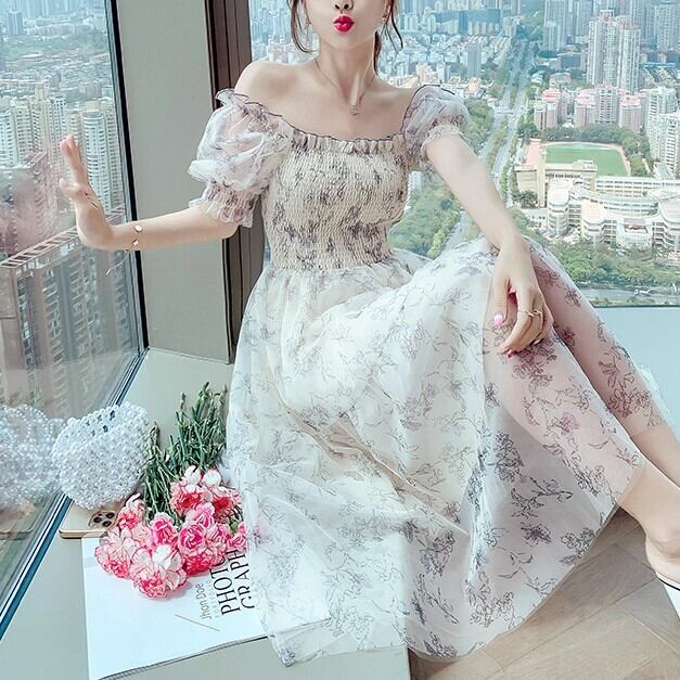 ワンピース ロング シフォン 花柄 総柄 フラワー パフスリーブ 胸シャーリング スクエアネック Aライン かわいい 夏 ウエストマーク ybh0942