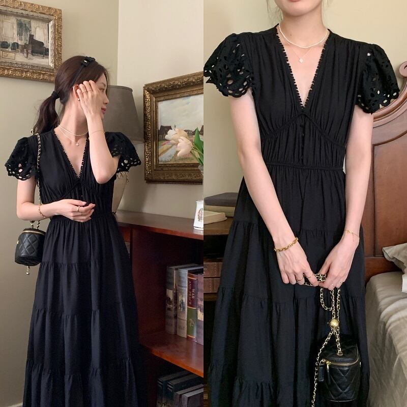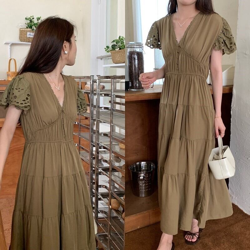 半袖ワンピース ティアード ドレス レース Vネック ロング丈 マキシ シンプル 無地 ボタニカル 細見え 春夏 可愛い 上品 ybh1042