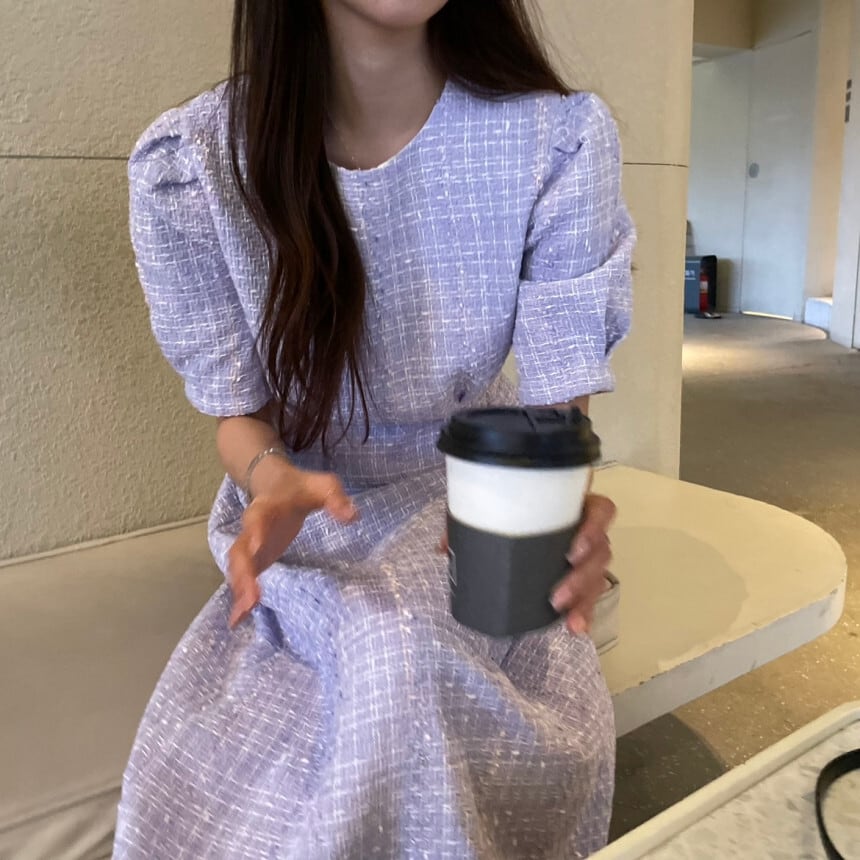 ワンピース ドレス チェック ツイード 5分袖 半 パフスリーブ ロング丈 ミモレ フリル 可愛い OL 仕事着 大人可愛い 上品 控えめ ybh1045