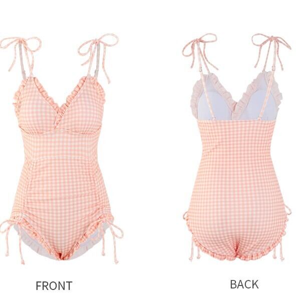 水着 ワンピース チェック 体型カバー ギャザー シンプル 肩ひもリボン 総柄 かわいい Vネック ガーリー フリル レトロ プール 夏 ybh1070