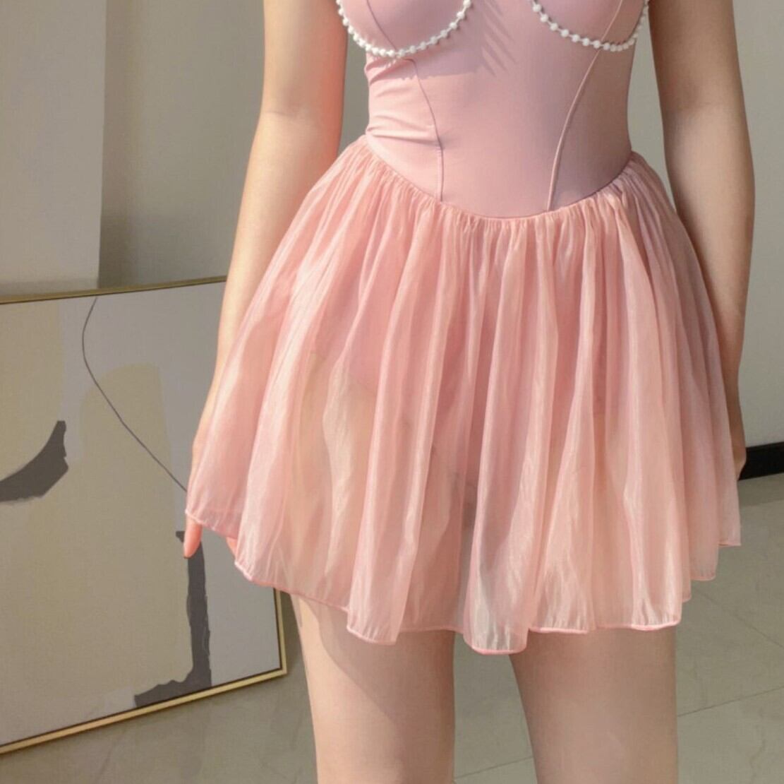 レディース 水着 ワンピース かわいい ガーリー 体型カバー ハイウエスト シフォンスカート 肩リボン パール お腹カバー プール 細見え バイカラー ybh1100