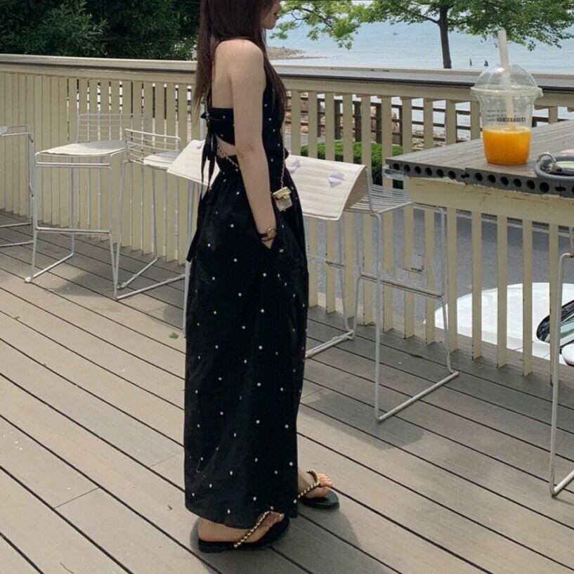 ワンピース レディース ドット 水玉 ロング バックリボン ノースリーブ リゾート 春 夏 カジュアル かわいい 総柄 切り替え ギャザー ybh1130