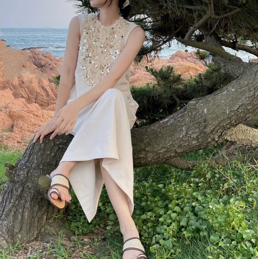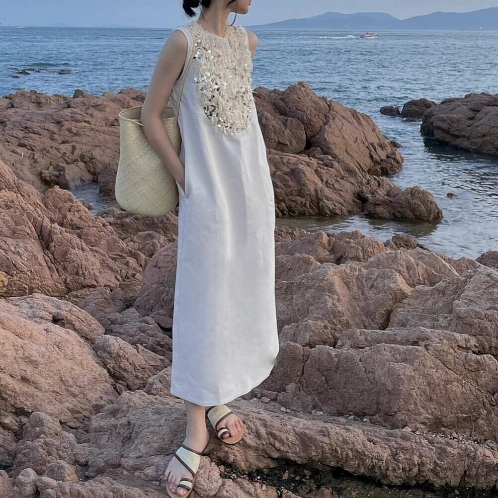 ワンピース レディース ロング ファー ノースリーブ リゾート シンプルラウンドネック 旅行 タンクトップ 海 夏 大人 カジュアル かわいい 個性的 無地 ybh1132