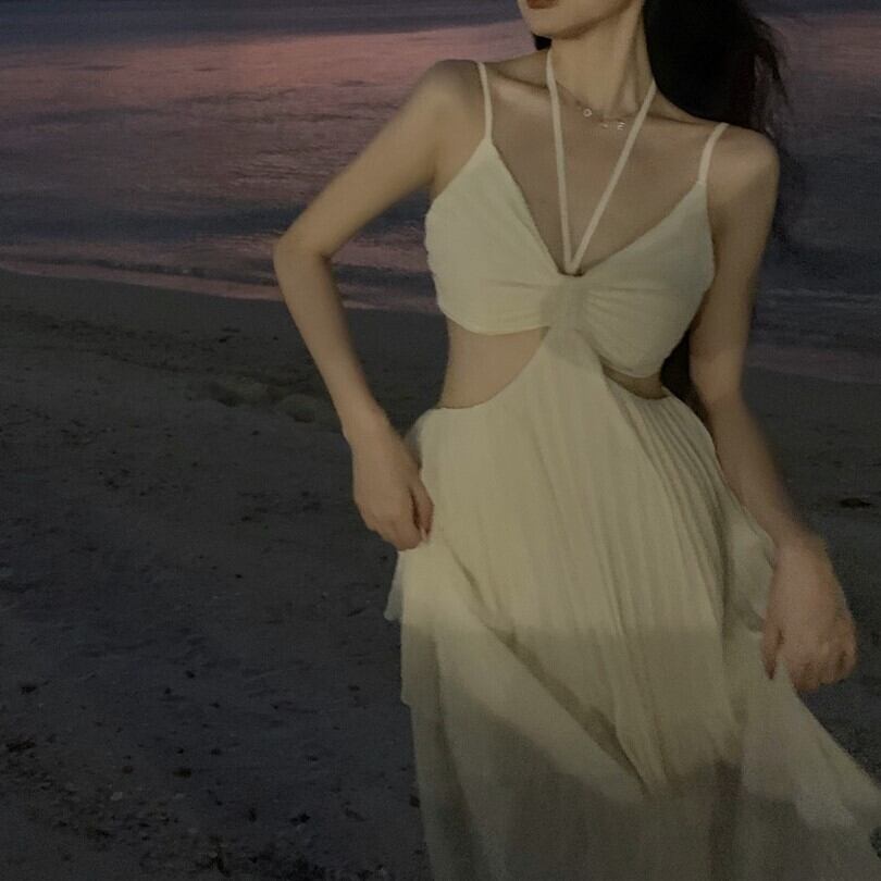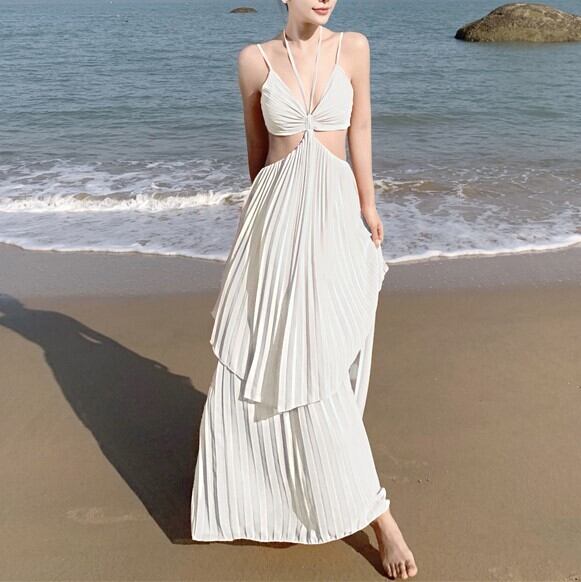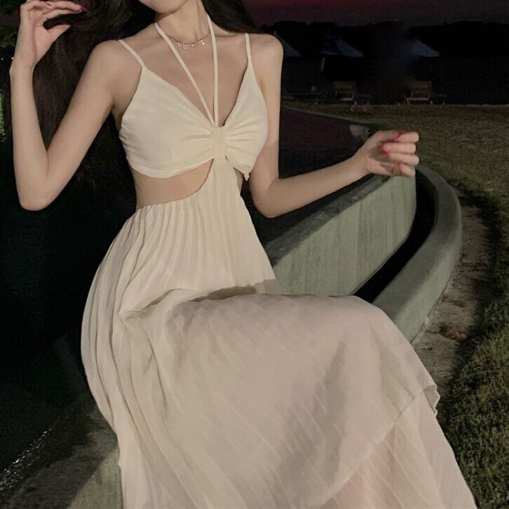 ワンピース ロング ドレス プリーツ ホルターネック 背中空き シフォン 大人 きれいめ リゾート 撮影 ウエスト セクシー リボン 変形 レディース ybh1198