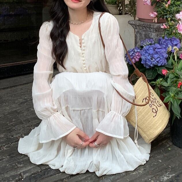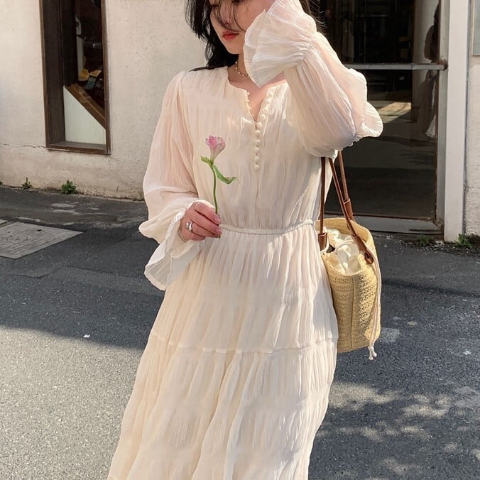 ワンピース シフォン ロング 長袖 ナチュラル ティアード 飾りボタン ラウンドネック 春 秋 ベルスリーブ ハイウエスト プリーツ ガーリー ybh1265