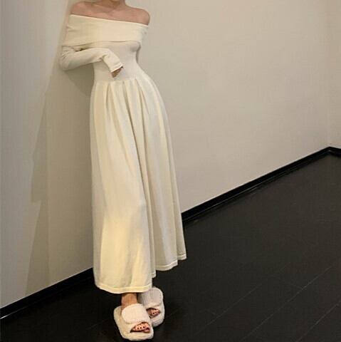 ワンピース オフショルダー ドレス きれいめ ロング ニット 大人 カジュアル きれいめ Aライン シンプル ハイウエスト 細見え タックスカート ybh1277