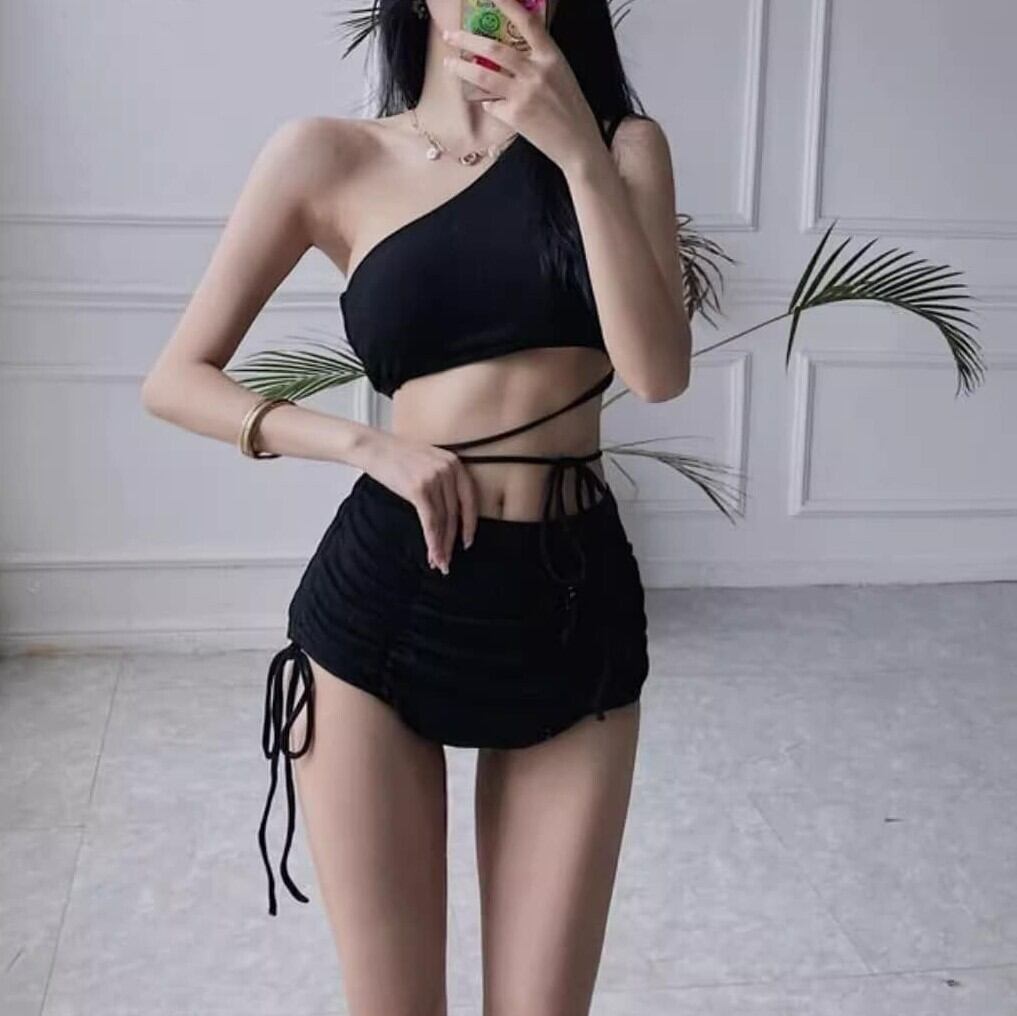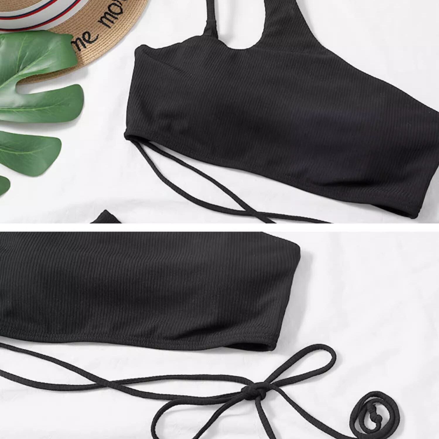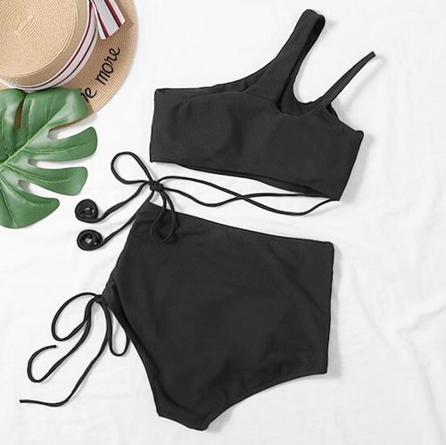 水着 タンキニ レディース セパレート ワンショルダー シンプル 黒 無地 ママ ハイウエスト ギャザー ハイウエスト レースアップ リボン 大人 ナイトプール ybh1408