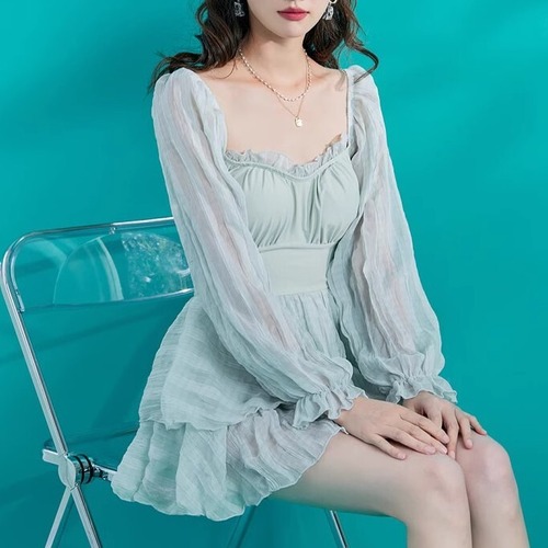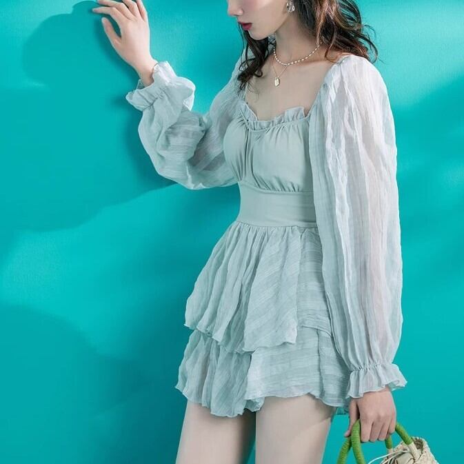 水着 ワンピース レディース かわいい パフスリーブ 長袖 日焼け対策 体型カバー シフォン 段スカート フリル ベルスリーブ プール 女の子 ybh1421