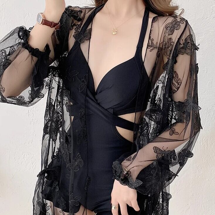 水着 ワンピース 羽織 2点セット バタフライ柄 ちょうちょ 体型カバー まま スイムウェア ホルターネック フロントクロス バックリボン ショートパンツ ybh1427