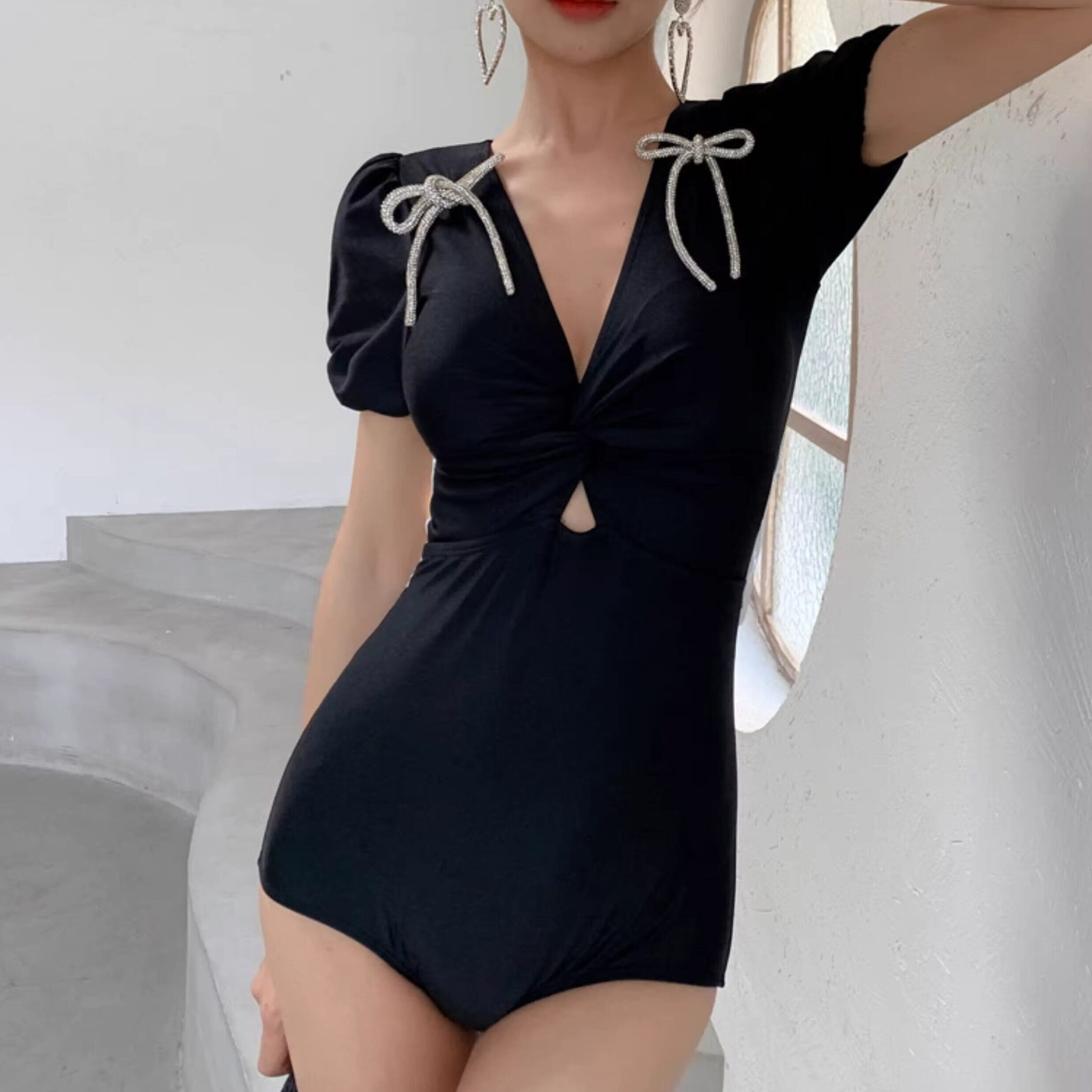 水着 ワンピース 半袖 バックリボン ビッグ ブラック 黒 スカート パフスリーブ 背中見せ 肌 脚長効果 細見え シンプル 無地 可愛い ガーリー 2WAY ybh1523