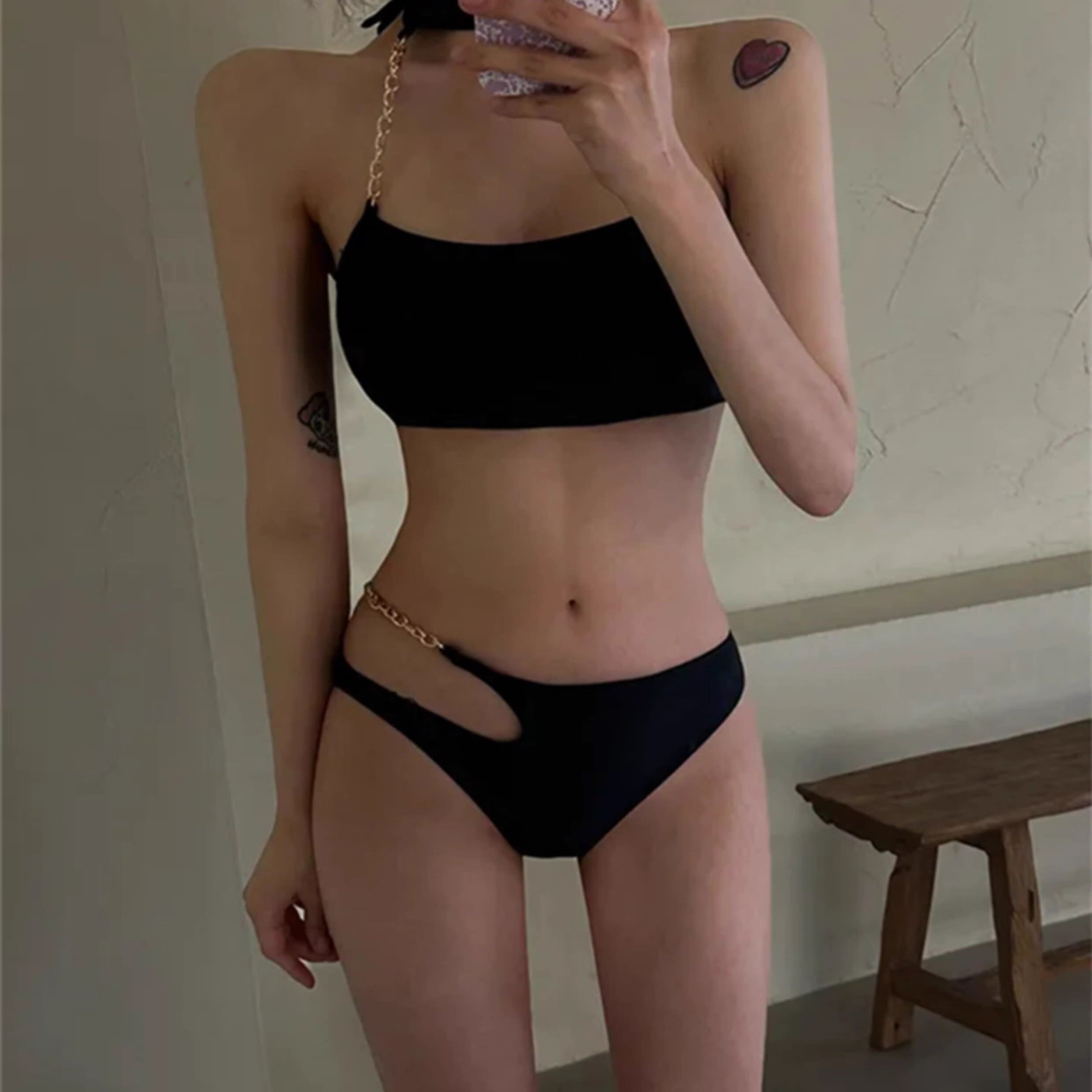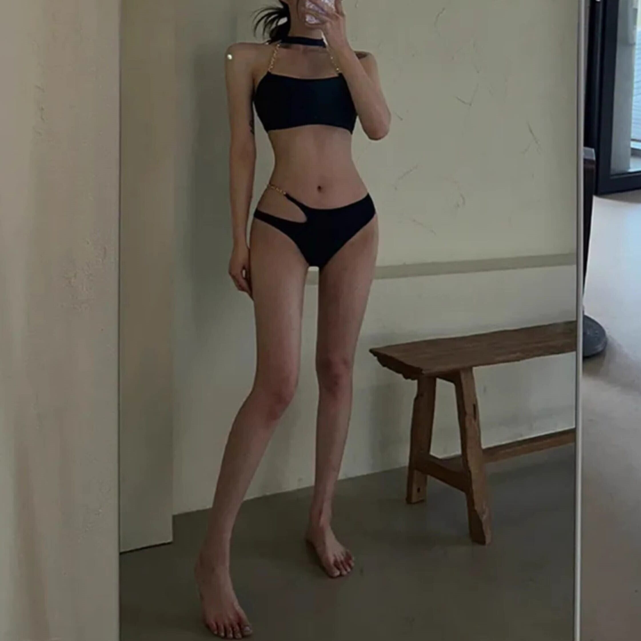 水着 タンキニ チェーン ホルターネック チョーカー 黒 ブラック ゴールド 細見え 脚長効果 ハイレグ 背中あき 肌見せ 日焼け 海 かっこいい セクシー 大人 ybh1536