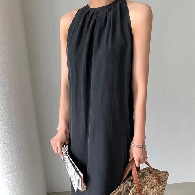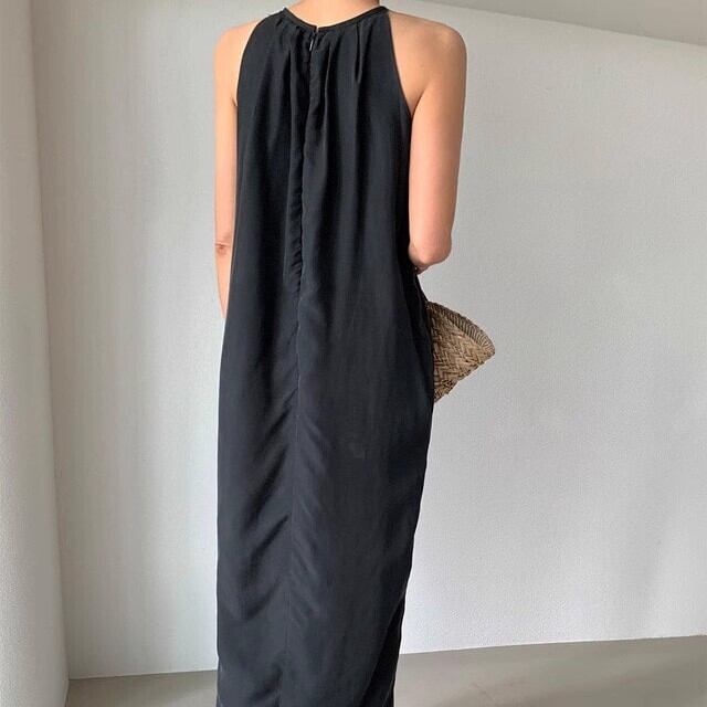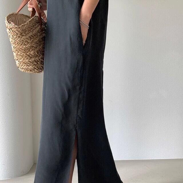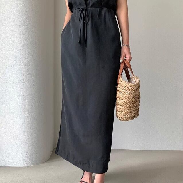 ワンピース ノースリーブ ロング アメリカンスリーブ Iライン カジュアル 大人 シンプル きれいめ ウエストマーク サマードレス 無地 スリット ybh1562