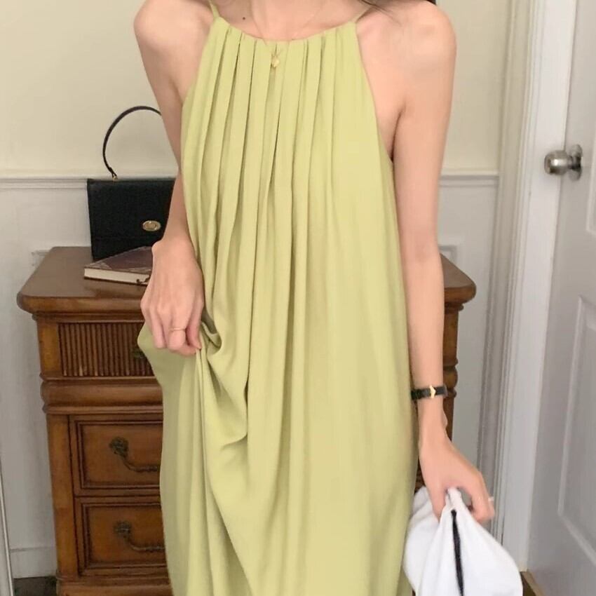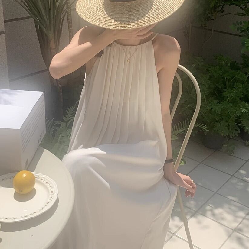 ワンピース ノースリーブ キャミソール サマードレス レディース シンプル ギャザー ドレープ ラウンドネック カジュアル きれいめ ロング リゾート 無地 ybh1564