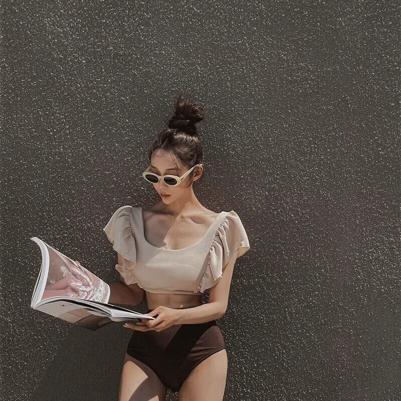 水着 セパレート ハイウエスト レディース スイムウェア ビッグフリル 淡色 体型カバー 日焼け対策 大人 プール ママ 二の腕カバー バイカラー 無地 ybh1597
