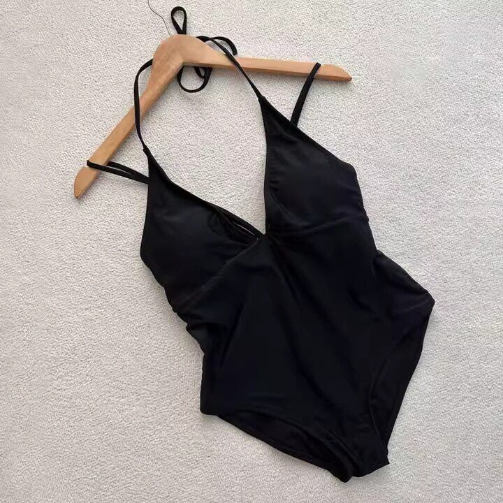 水着 レディース ワンピース ホルターネック Vネック ブラック 肌見せ 背中空き セクシー シンプル 紐 リボン 大人 可愛い ybh1605