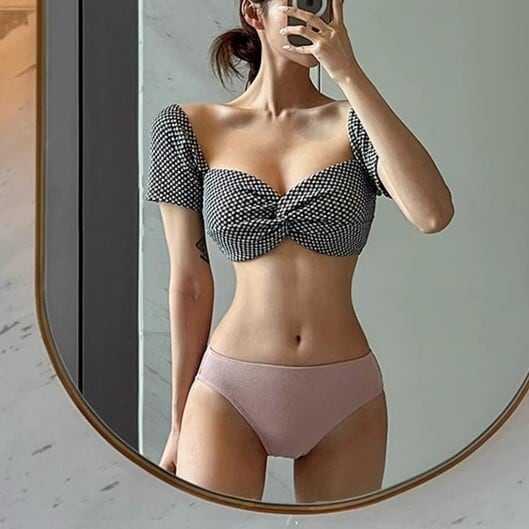 水着 レディース タンキニ ピンク 黒 ギンガムチェック かわいい オフショルダー 半袖 袖付き フロントリボン スクエアネック プール スイムウェア ybh1615