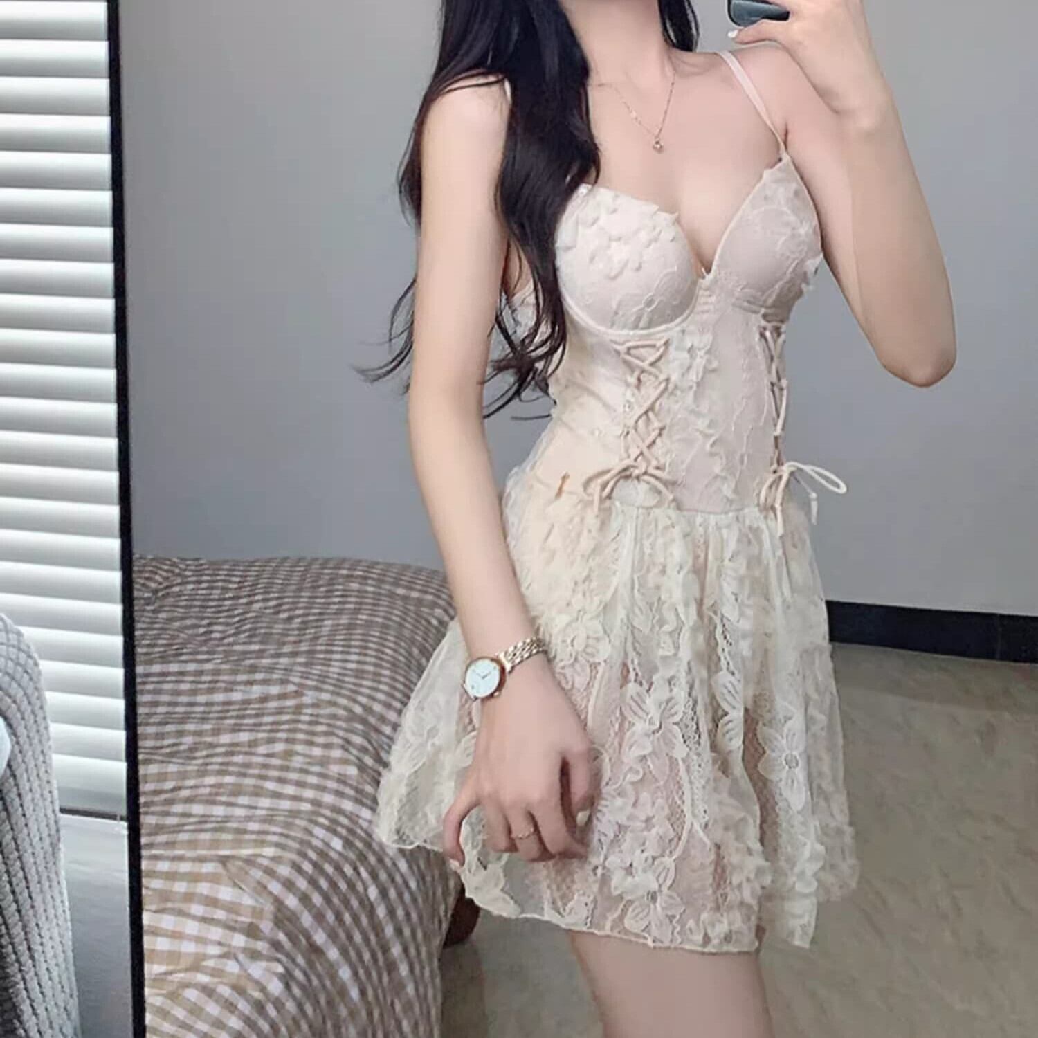水着 ワンピース レディース 総レース レースアップ スイムウェア スカート 大人 透け感 ノースリーブ プール バッククロス 総柄 黒 ベージュ ybh1617