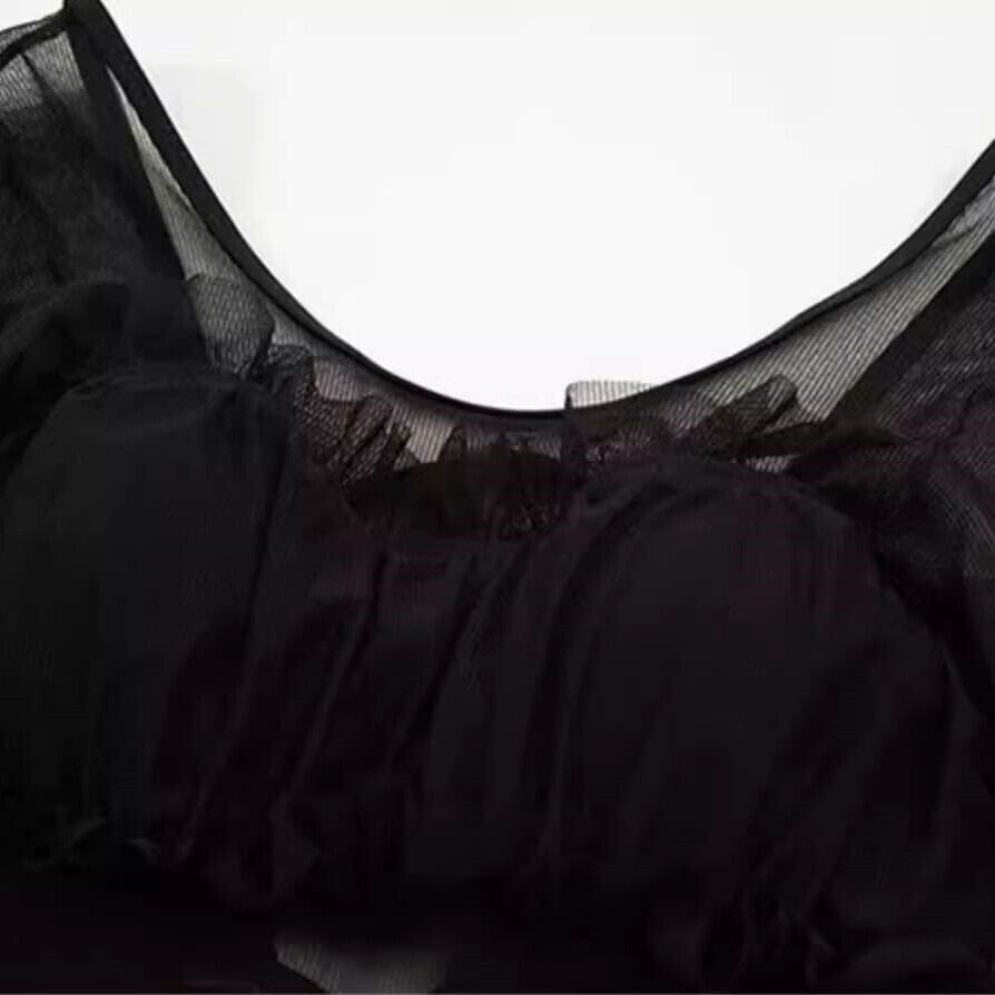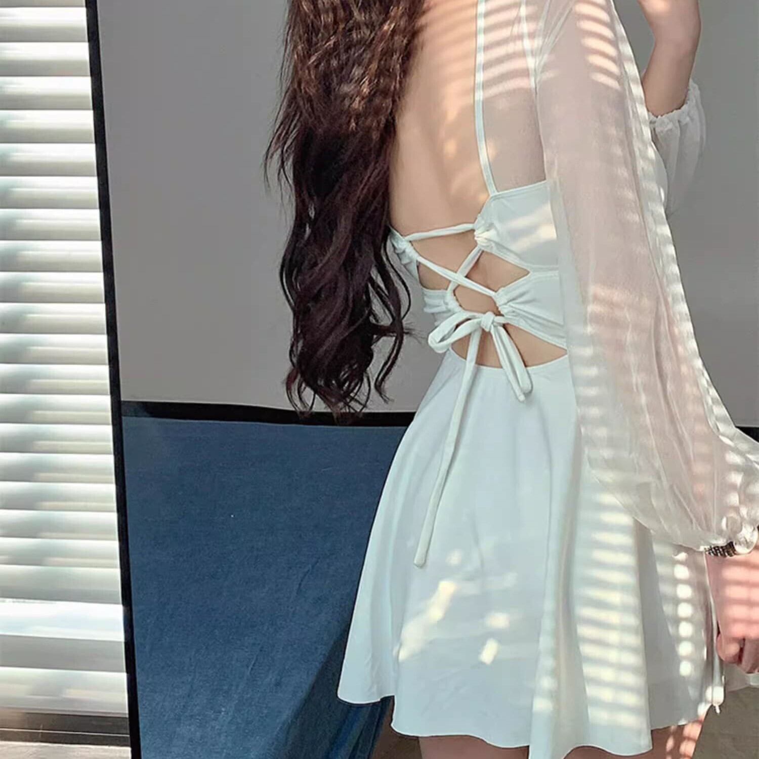 水着 ワンピース シースルー スカート 袖付き 長袖 シフォン パフスリーブ 体型カバー ハイウエスト かわいい ガーリー 黒 白 レースアップ 透け感 ybh1620