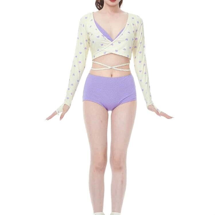 水着 セパレート タンキニ 3点セット パステル 日焼け対策 羽織 体型カバー 長袖 ハート柄 かわいい レディース スイムウェア クロス ウエストマーク ybh1638