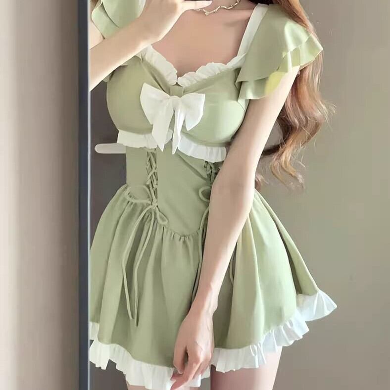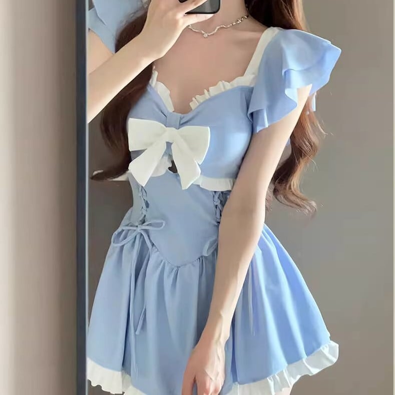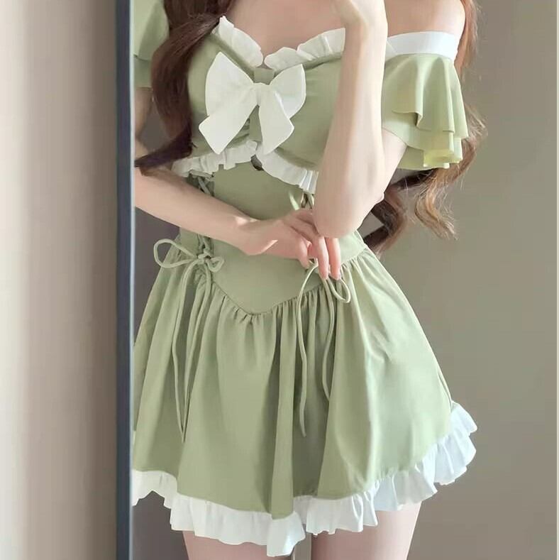 水着 ワンピース レディース ガーリー かわいい 肩フリル オフショルダー レースアップ フロントリボン 体型カバー プリンセス ガーリー ロリータ プール ybh1667