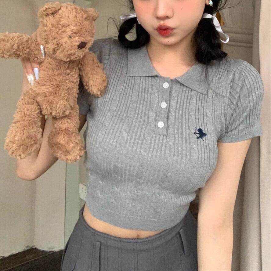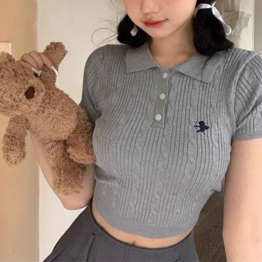 ニット 半袖 ケーブル レディース 襟 ポロシャツ ショート丈 お腹見せ ワンポイント 細見え タイト スリム 学生 可愛い カジュアル ybh1733