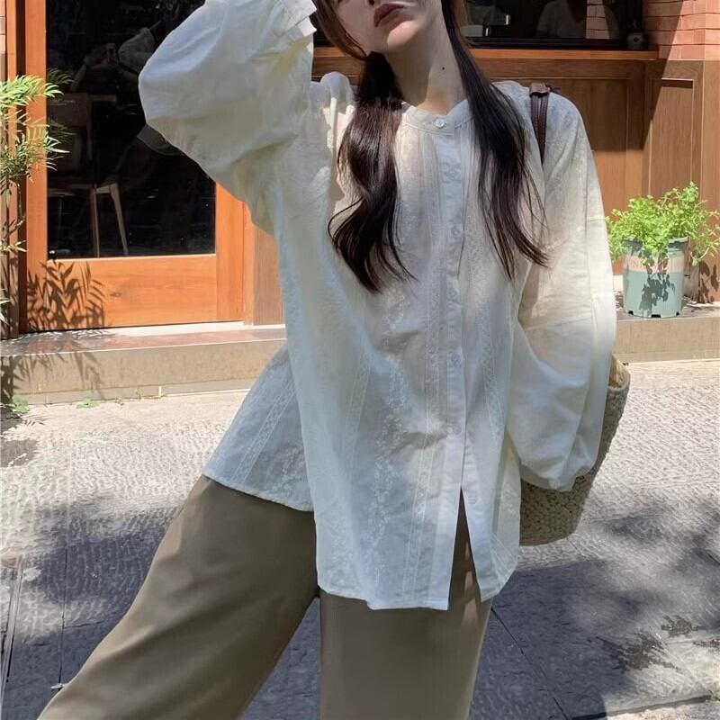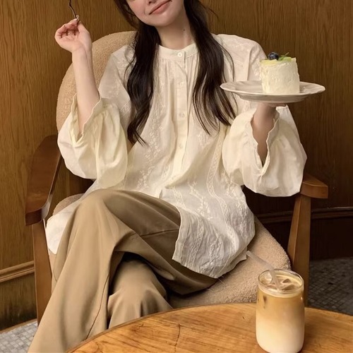 トップス チュニック レディース バルーンスリーブ ナチュラル 生成り ブラウス ノーカラー シャツ コットンレース シンプル 大人 ママ ドロップショルダー ybh1747