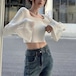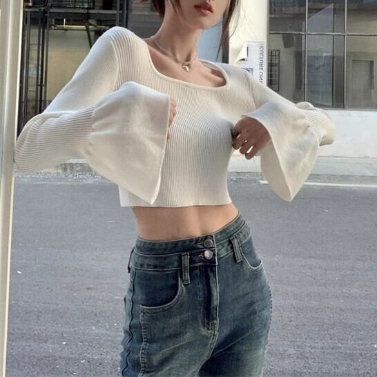 トップス ニット ショート丈 長袖 レディース スクエアネック ベルスリーブ リブ 細見え 白 きれいめ カジュアル トレンド ybh1804