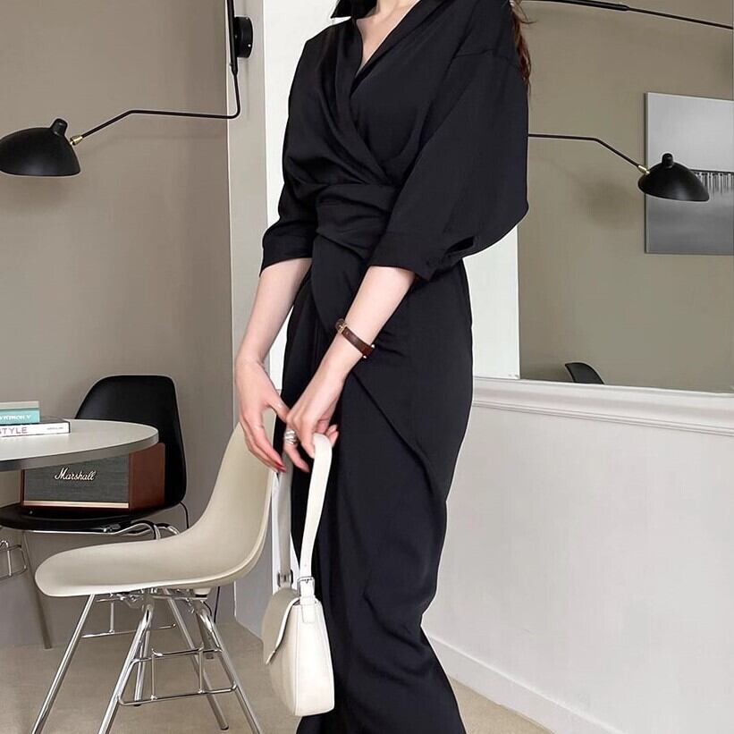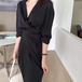 ワンピース ラップドレス Vネック 無地 7分丈 ロング タイトスカート パフスリーブ 開襟 ハイウエスト きれいめ オフィス お呼ばれ ybh1811