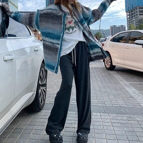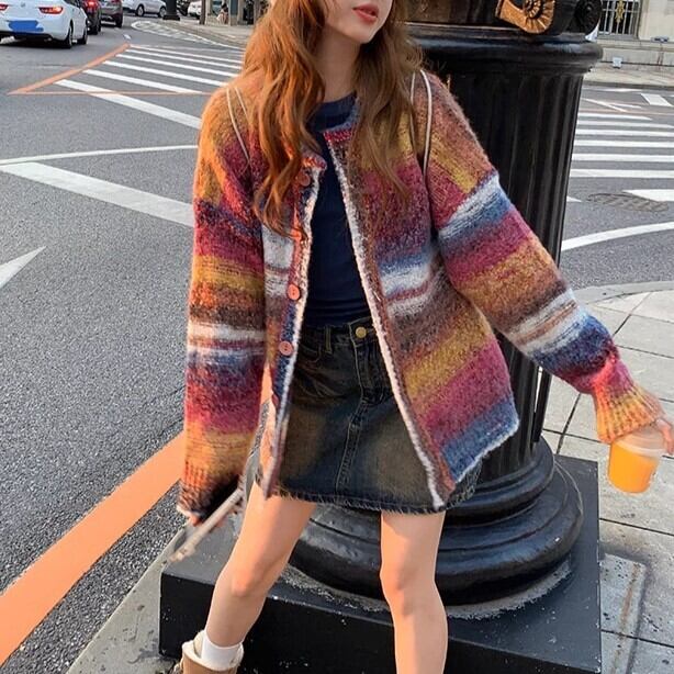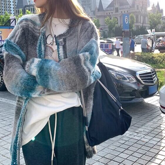 カーディガン セーター レディース オーバーサイズ マルチボーダー ドロップショルダー カジュアル ラウンドネック トップス ybh1867
