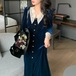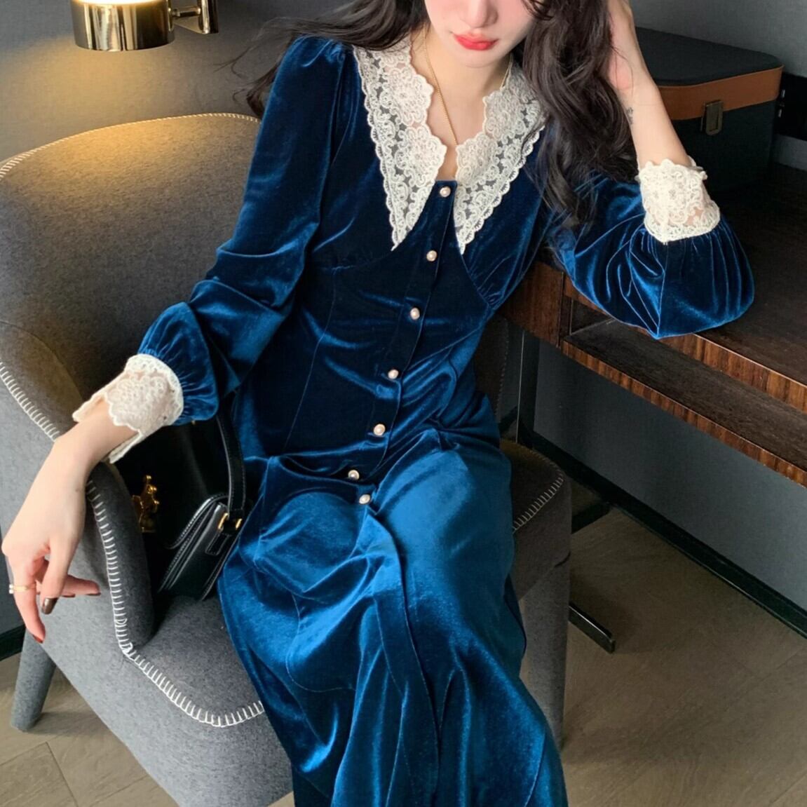 ワンピース ベルベット コーデュロイ Vネック レース 襟 レディース ミモレ丈 Aライン ビッグカラー 長袖 袖フリル ボタン シンプル きれいめ ybh1949