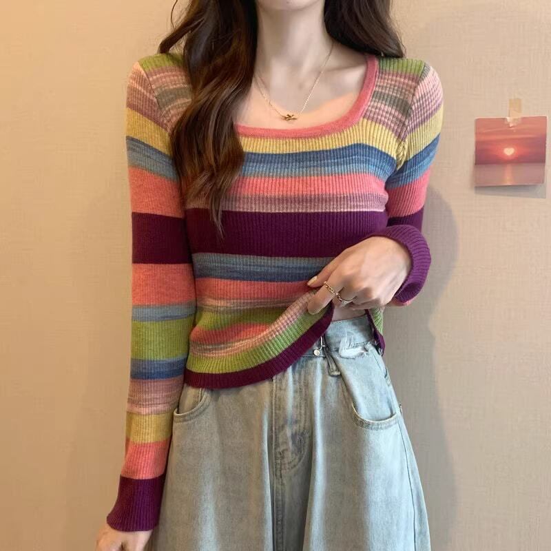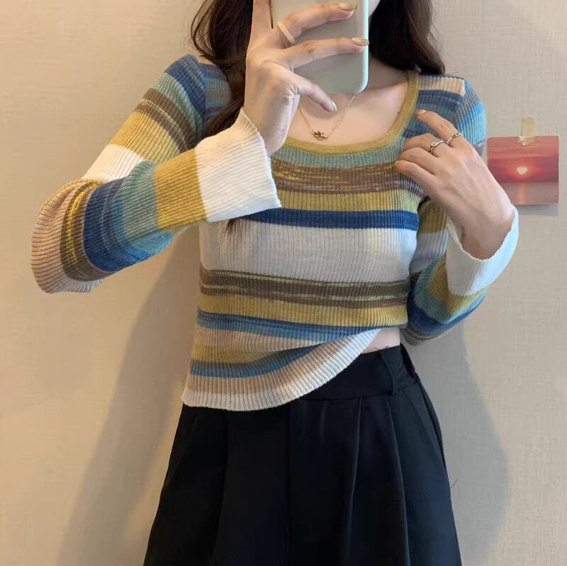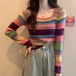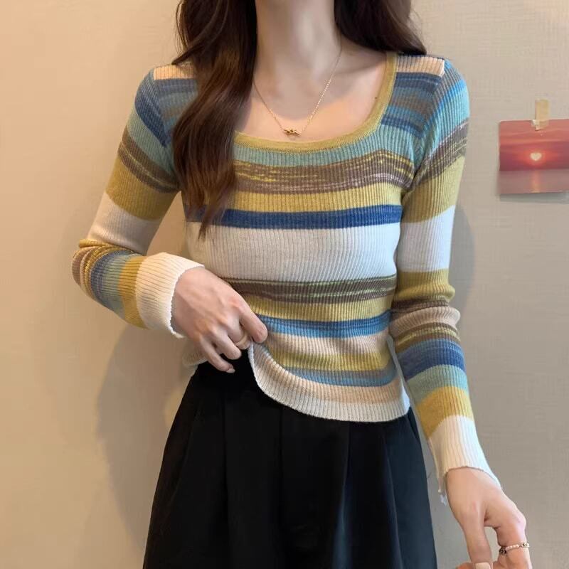 ニット ボーダー 長袖 カラフル レディース トップス セーター スクエアネック タイト シンプル 細見え 可愛い 着回し ybh1950