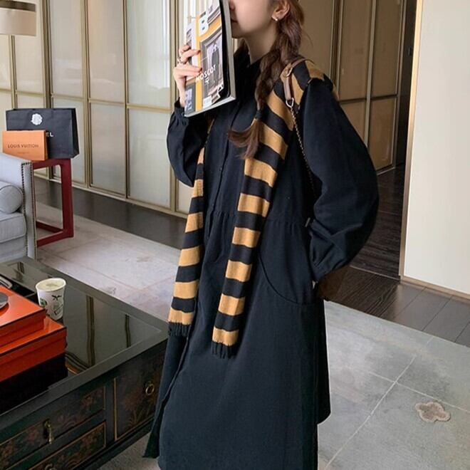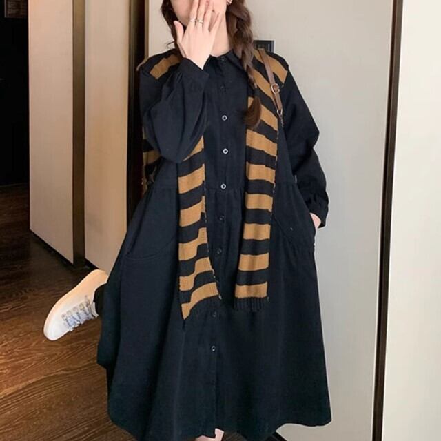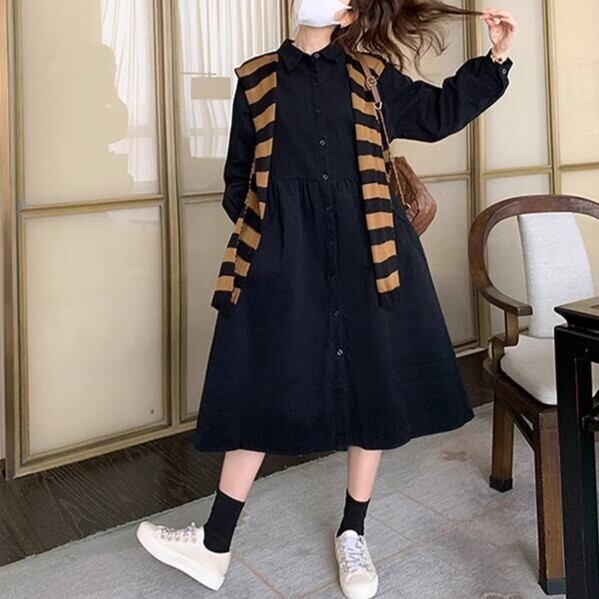シャツワンピース 長袖 レディース ミモレ丈 Aライン フェイク 袖 ボーダー 黒 襟 ボタン 無地 シンプル 秋冬 カジュアル 可愛い ybh1966