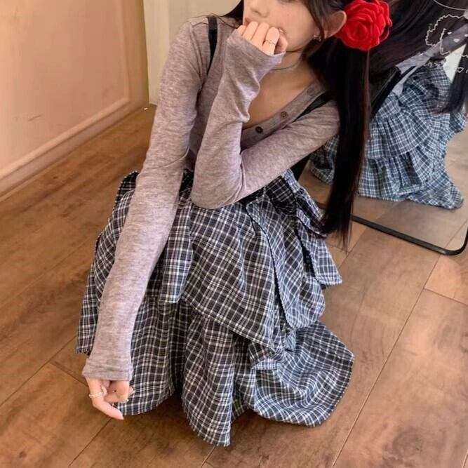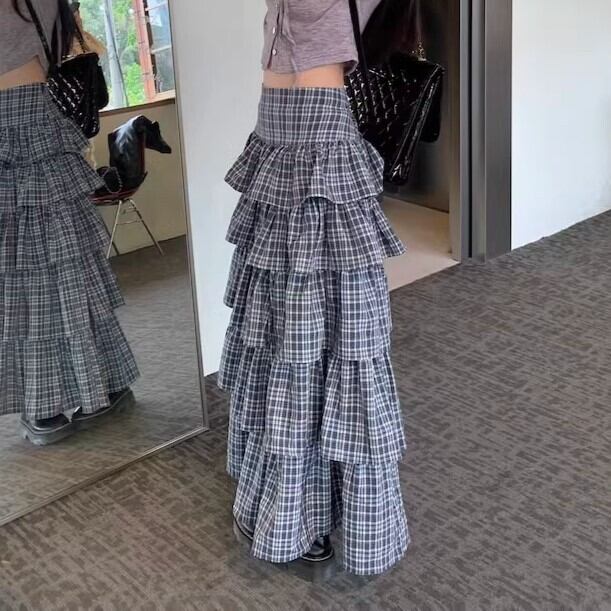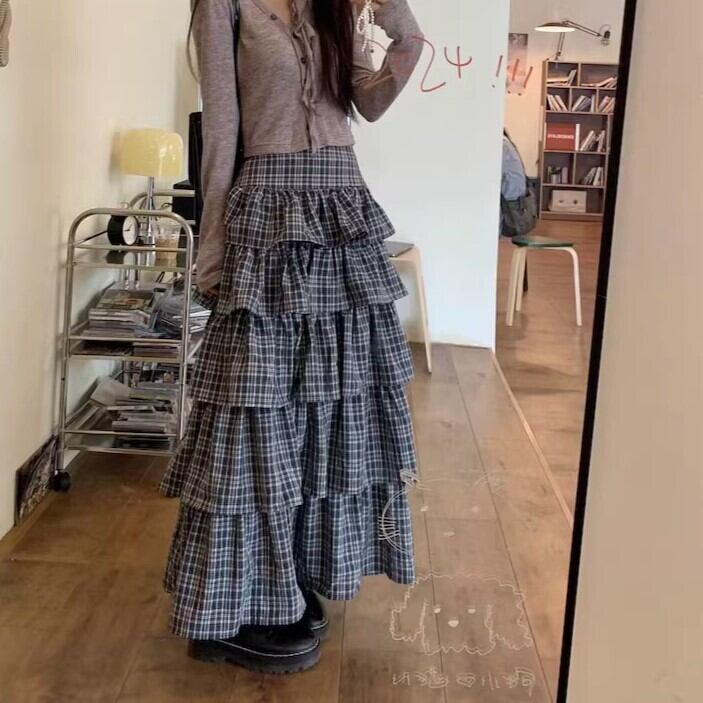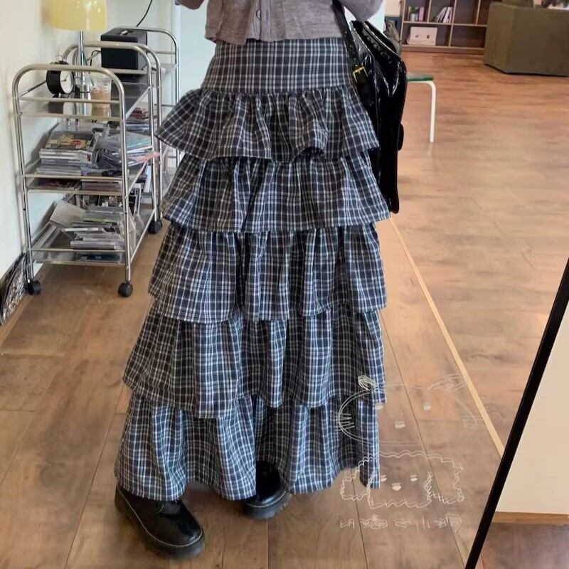 ロングスカート レディース フリル かわいい 大人 チェック Aライン ボリューム ガーリー 細見え ハイウエスト 総柄 英国風 ybh2054