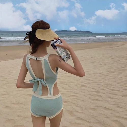 水着 ワンピース レディース バイカラー ショートパンツ 体型カバー スイムウェア かわいい カジュアル バックリボン 夏 リゾート ybh2134