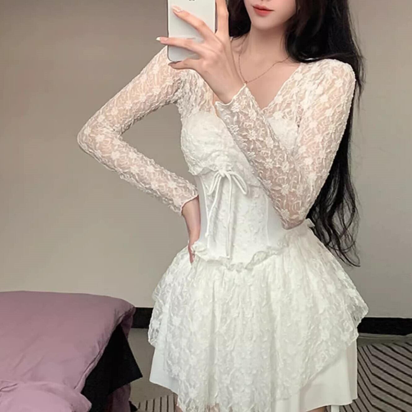 水着 ワンピース 総レース レディース スイムウェア 長袖 体型カバー 日焼け対策 ハイウエスト フリルスカート 細見え リゾート きれいめ ybh2150