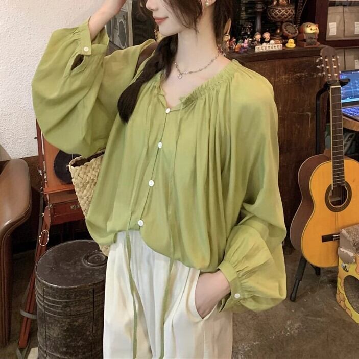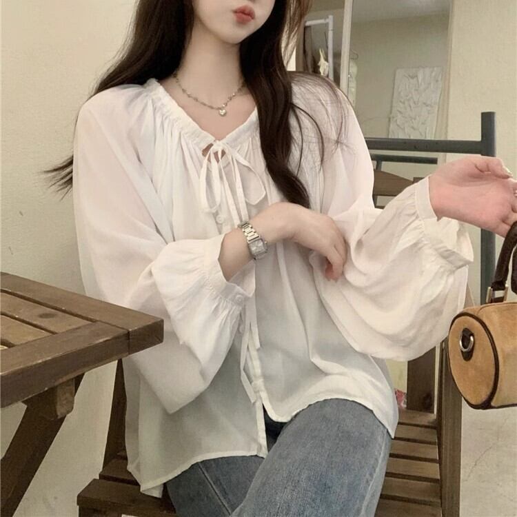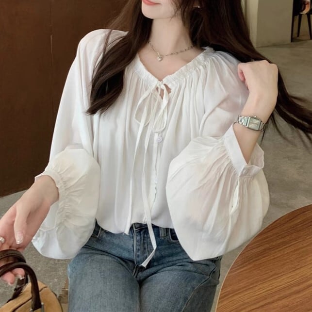ブラウス 長袖 レディース 秋 春 ドルマンスリーブ ボリューム ナチュラル ラウンドネック ギャザー ネックリボンデザイン ゆったり 無地 ybh2216