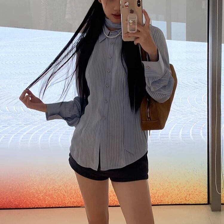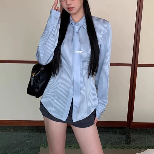 シャツ トップス レディース タイト リボンタイ ネクタイ ストライプ 長袖 細見え ガーリー 春 秋 セットインスリーブ ybh2229