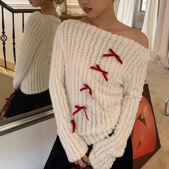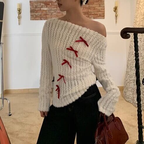 ニット セーター レディース ガーリー オフショㇽダー タイト リボン 長袖 トップス セットインスリーブ かわいい ybh2230