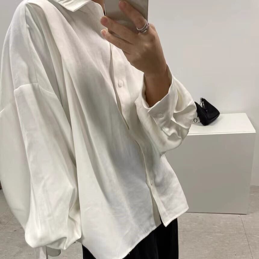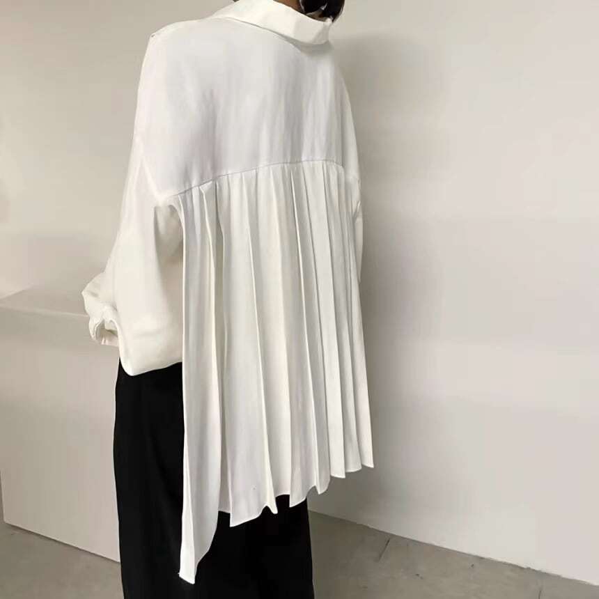 シャツ トップス レディース 長袖 プリーツ バックデザイン シンプル 無地 きれいめ 大人 ドロップショルダー 開襟 ボリュームスリーブ ybh2256